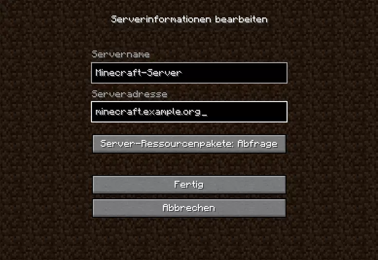 Nun können Sie und Ihre Mitspielerinnen und Mitspieler sich über die Domain auf den Minecraft-Server einloggen. Dafür wählen Sie im Startmenü des Spiels den Multiplayer-Modus und fügen dann einen neuen Server hinzu. Unter „Serveradresse“ tragen Sie nun die Domain ein. Den Namen des Servers können Sie frei wählen. Mit einem Klick auf „Fertig“ fügt die Software den Server hinzu. Jetzt brauchen Sie sich nur noch einzuloggen.