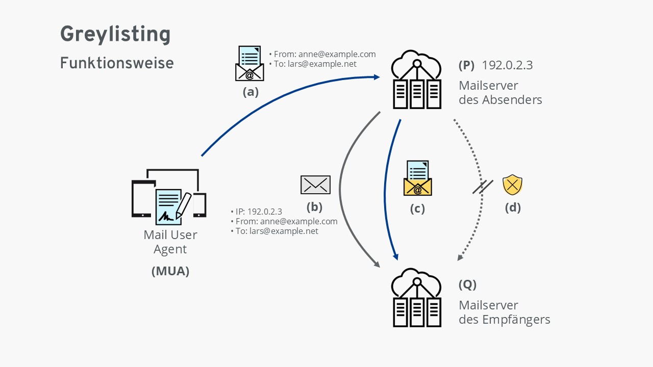 (b) Der Mailserver der absendenden Person (P) reicht die E-Mail an den Mailserver des bzw. der Empfangenden (Q) weiter. Dieser überprüft die Umschlagdaten der E-Mail: IP-Adresse des sendenden Servers sowie die beteiligten E-Mail-Adressen. Ist die Kombination dieser drei Daten dem Mailserver des Empfängers bzw. der Empfängerin (Q) noch nicht untergekommen, lehnt der Server den Empfang der E-Mail mit Hinweis auf einen technischen Fehler zunächst ab. Der Mailserver des bzw. der Empfangenden (Q) vermerkt die Umschlagdaten in einer Tabelle; die E-Mail wird „greylisted“.