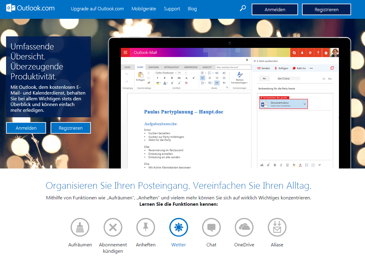 Das alles ist bei Outlook.com ebenfalls kostenlos. Es besteht allerdings die Möglichkeit, auf eine kostenpflichtige Premium-Version umzusteigen. In diesem Fall wird die Werbung in der Browseroberfläche ausgeblendet. Stichwort Werbung: Diese wird laut den Nutzungsbestimmungen von Microsoft nicht über die Analyse von Mailinhalten personalisiert. Stattdessen werden dafür Daten wie etwa der Standort oder das Surfverhalten mittels Cookies herangezogen. In den Datenschutzbestimmungen heißt es wörtlich: „Zur Schaltung von Anzeigen, die zu Ihren Interessen passen, verwenden wir Daten wie Ihre Position, Bing-Suchanfragen, von Ihnen besuchte Webseiten von Microsoft oder Werbekunden, demografische Informationen und Ihre Favoriten. Wir verwenden jedoch keinesfalls Inhalte Ihrer E-Mails, Chats, Videoanrufe, Voicemails, Dokumente, Fotos oder anderer persönlicher Dateien für gezielte Werbung.“