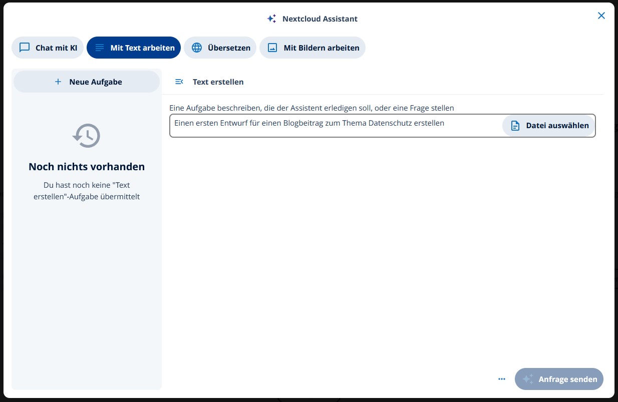 Das „Assistant“-Modul von Nextcloud Workspace basiert auf künstlicher Intelligenz und zielt darauf ab, alltägliche Arbeitsprozesse effizienter zu gestalten. Der Assistent kann Texte automatisch zusammenfassen, Inhalte generieren, intelligente Suchvorschläge liefern und hilft dabei, Informationen schneller zu organisieren oder zu analysieren. Darüber hinaus integriert sich die KI-Lösung nahtlos in verschiedene Nextcloud-Apps wie Chat, Mail oder Files und bietet dort kontextbezogene Empfehlungen oder Antworten.