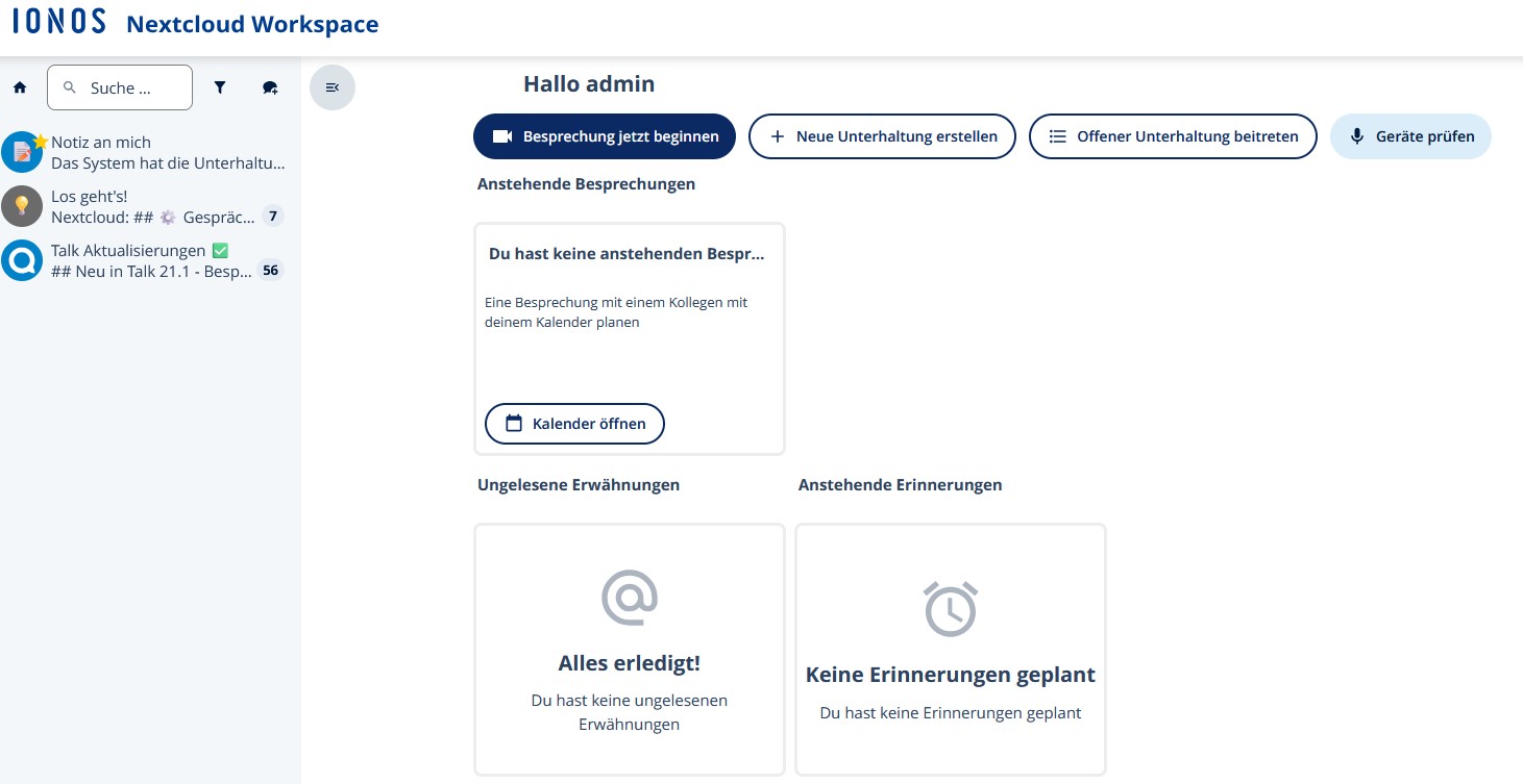 Nextcloud Talk ist die integrierte Kommunikationsplattform für Chats, Audio- und Videokonferenzen. Sie ermöglicht sichere Echtzeitkommunikation innerhalb des Unternehmens, ohne dabei auf externe Anbieter wie Zoom oder Teams setzen zu müssen.
