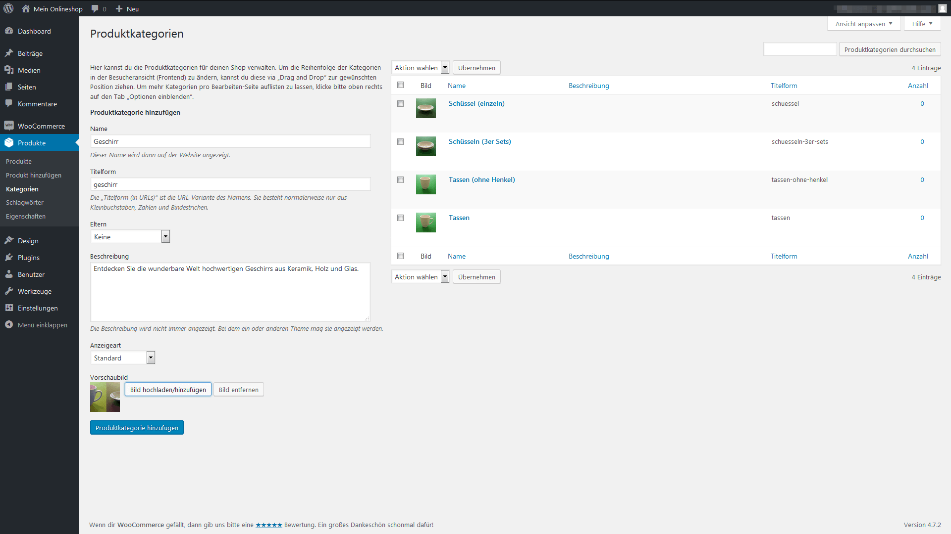 Des Weiteren können Sie Produkte in Kategorien einordnen, um Ihren Shop besser zu strukturieren. Dazu gehen Sie im Menü „Produkte“ auf „Kategorien“ und erstellen neue Kategorien für Ihre Produkte. Dies erleichtert Ihrer Kundschaft das Navigieren und Finden der gewünschten Artikel. Kategorieseiten sind besonders wichtig für die Benutzerführung, da sie eine Übersicht über ähnliche Produkte bieten und den Kundinnen und Kunden helfen, schnell das richtige Produkt zu finden. Achten Sie darauf, dass jede Kategorie eine klare und präzise Beschreibung enthält, um sowohl den Nutzern als auch den Suchmaschinen zu helfen, den Inhalt richtig einzuordnen.