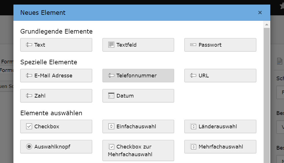 - Im nächsten Schritt klicken Sie auf „Neues Element erstellen“, um den Inhalt des Formulars zu gestalten. Dabei haben Sie unterschiedliche Möglichkeiten: Neben reinen Textfeldern, die zum Beispiel für Namen, Adressen oder Kontaktdaten genutzt werden können, gibt es unter anderem Checkboxen, einfache oder mehrfache Auswahlmöglichkeiten und fortgeschrittene Elemente wie Upload-Buttons, Datumangaben, Passworteingabe oder versteckte Elemente.