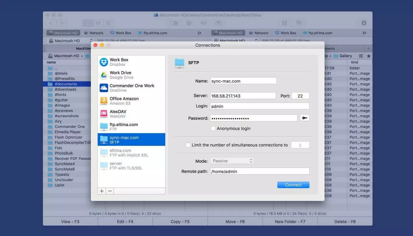Der Mac-Dateimanager Commander One ist nach Upgrade auf die kostenpflichtige Pro-Edition unter anderem auch als FTP-Client einsetzbar. Zusätzlich zu den Protokollen FTP, FTPS und SFTP unterstützt die Software dann auch den Datenaustausch via WebDAV und mit den Onlinespeicher-Lösungen Dropbox, OneDrive, Google Drive, Amazon S3. Um möglichst effiziente und schnelle Upload- und Downloadprozesse gewährleisten zu können, lässt Commander One die gleichzeitige Übertragung mehrerer Dateien zu, wobei eine Warteschlangenfunktion Bandbreiten-Engpässe verhindert. Optional können Nutzer beim Verbindungsaufbau mit dem jeweiligen FTP-Server auch ein Limit für gleichzeitig stattfindende Verbindungen festlegen. Die wichtigsten Features des FTP-Programms für macOS in der Zusammenfassung: