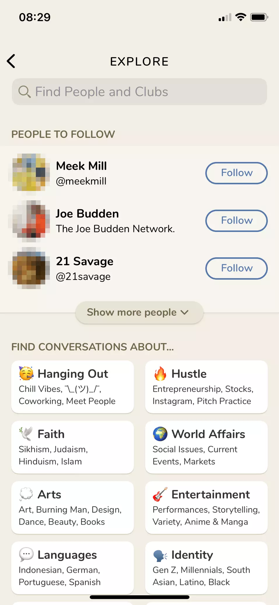 Da Clubhouse auch ein soziales Netzwerk ist, darf die Freundesliste nicht fehlen. Abhängig von den Interessen der Kontakte zeigt die App auf der Startseite Vorschläge für Räume an. Die Idee ist: Was Ihren Freunden gefällt, dafür interessieren auch Sie sich. Ähnlich wie bei Facebook und anderen Social-Media-Lösungen steckt also auch bei Clubhouse ein Algorithmus im Hintergrund. Nach und nach kann man aber auch eigene Interessensgebiete definieren und so die Startseite beeinflussen oder sich durch Themenbereiche klicken.