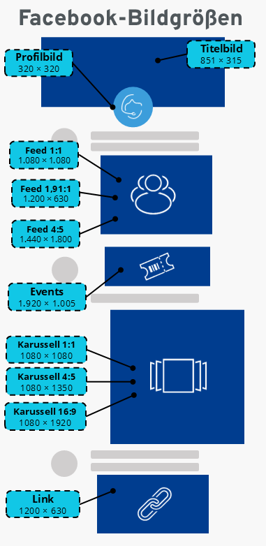 Zum aktuellen Zeitpunkt verfügt Facebook über eine Reihe von Bildtypen und entsprechenden Bildgrößen. Die wichtigsten Typen in der Zusammenfassung: