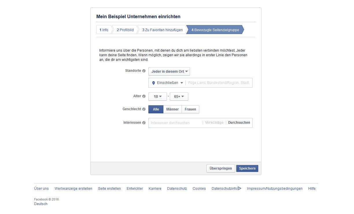 Im letzten Schritt der Einrichtung ermöglicht es Facebook einem Unternehmen, eine genaue Zielgruppe festzulegen. Wer hier präzise Angaben zur potenziellen Zielgruppe macht, erhöht die Wahrscheinlichkeit, dass genau diese Mitglieder die Facebook-Unternehmensseite vorgeschlagen bekommen. Die Zielgruppe wird durch Auswahl von Standort, Alter, Geschlecht und Interessen definiert.