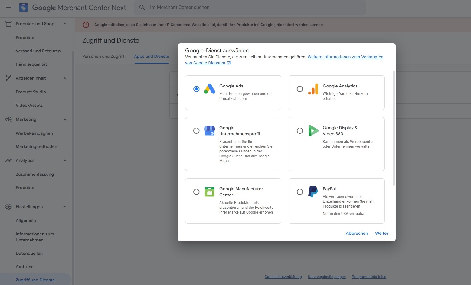 - Wählen Sie das verknüpfte Merchant-Center-Konto aus.