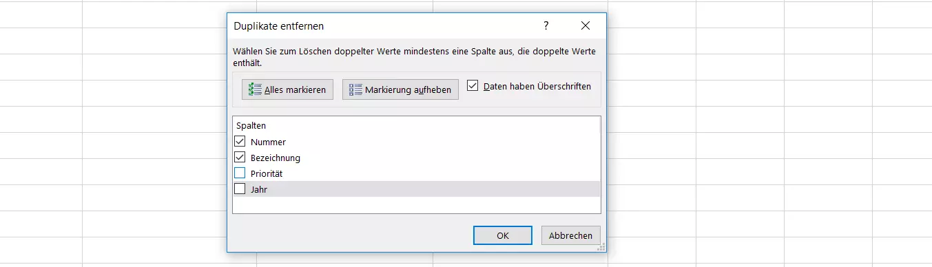 Im Duplikate-entfernen-Dialogfenster entfernen Sie nun jeweils das Häkchen in den Checkboxen neben den Tabellenspalten, die bei der Einstufung als Duplikat keine Rolle spielen sollen – in unserer Beispiel-Tabelle also die beiden Spalten „Priorität“ und „Jahr“. Anschließend bestätigen Sie die Änderungen über den OK-Button: