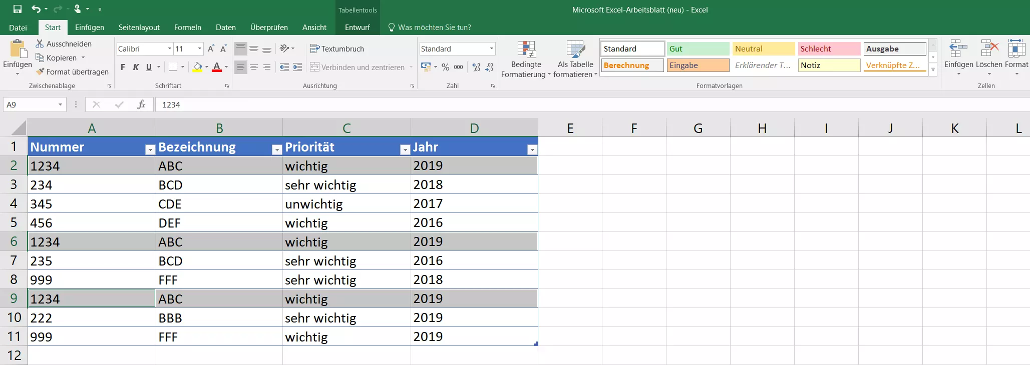 Wären in unserer Tutorial-Excel-Tabelle zum Beispiel die Werte in den Spalten „Priorität“ und „Jahr“ irrelevant, hätten wir nach der Aussortierung der gänzlich übereinstimmenden Einträge noch ein weiteres Duplikat in den Zeilen 7 und 9: