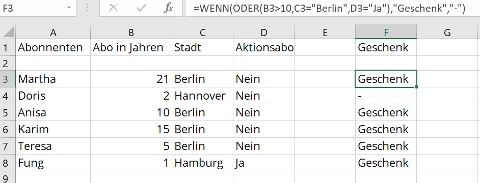 Um nicht WAHR oder FALSCH als Ausgabewert zu erhalten, kombinieren Sie die Funktion wie bereits beschrieben mit der WENN-Funktion und definieren den Ausgabewert selbst. Die Ausgabewerte in diesem Beispiel sind entweder „Geschenk“, wenn mindestens ein Kriterium zutrifft oder „-“, wenn kein Kriterium zutrifft.