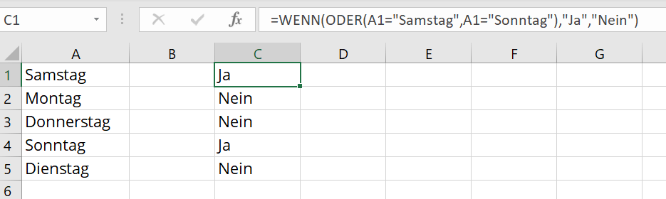 Möchten sie Text in die Untersuchung einer Bedingung einbauen, so setzen Sie diesen in der Syntax der Funktion immer in doppelte Anführungszeichen. Die ODER-Funktion soll nun prüfen, ob in einer Spalte mit Wochentagen „Samstag“ oder „Sonntag“ auftauchen.