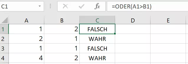 =ODER(A1>B1)Da dies nicht zu trifft, gibt die Funktion FALSCH aus.