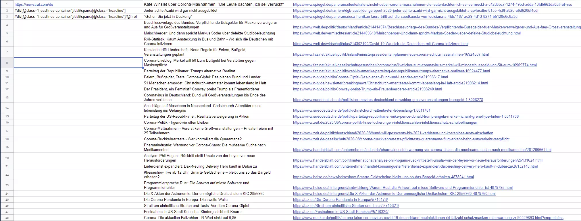 //div[@class="headlines-container"]/ul/li/span/a[@class="headline"]- Die Funktion in der Google Tabelle anwenden