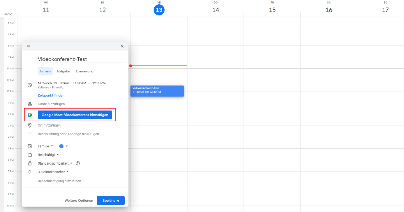 Ein Meeting zu einem zukünftigen Termin lässt sich standardmäßig nur mit einem Google-Workspace-Abo direkt in Google Meet anlegen. Über den Google-Kalender funktioniert es allerdings auch mit der kostenlosen Version: Tragen Sie hierzu einfach im Kalender den Termin, Titel und Zeitpunkt ein und wählen Sie die Option „Google Meet-Videokonferenz hinzufügen“. Laden Sie die Teilnehmer anschließend per Link-Versand ein.