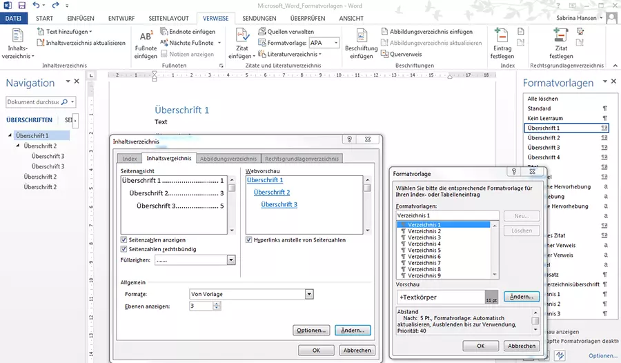 Sie können das Layout und die Textformatierung einer Word-Vorlage für Inhaltsverzeichnisse auch Ihren Wünschen anpassen:
