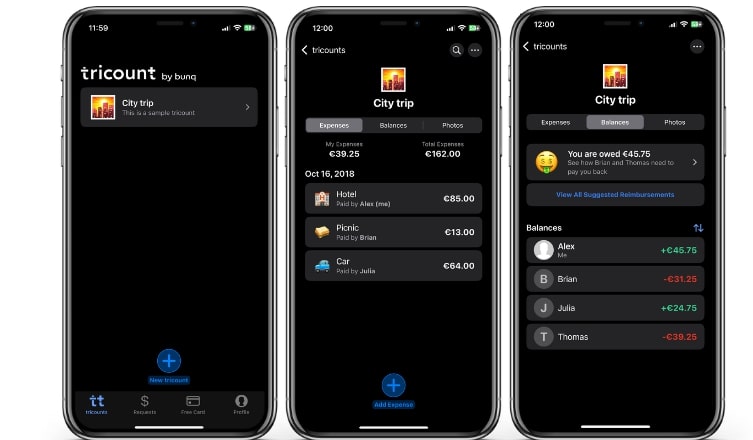 | Tricount | Android, iOS, Web | Unbegrenzte Ausgaben, keine Registrierung, PayPal-Integration, Online-Backups, Währungsumwandler, Taschenrechner, Fotouploads, Offlinemodus, monatliche Insights, Splitwise-Import | ✗ (keine Premium-Version vorhanden) |