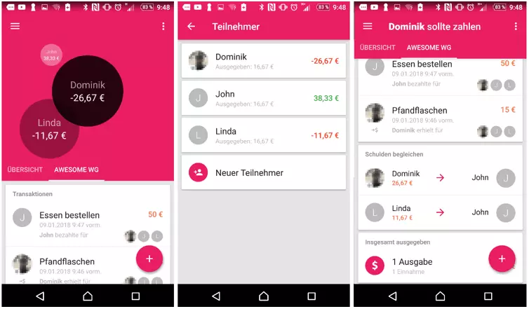 Die kostenlose App (Android und iOS) und Webanwendung punktet mit leichter Bedienung und einer Fülle an Features. So können Sie mit Splitwise die entstandenen Kosten teilen, individuell benennen und speichern, Schulden gegeneinander aufrechnen und persönliche Erinnerungen zur Schuldenbegleichung an Ihre Freunde versenden. Ebenso erhalten Sie von der App auf Wunsch regelmäßig Erinnerungen, wenn Sie selbst Schulden begleichen müssen. Diese können mit einer direkten Bankverbindung bezahlt werden. Eine Integration von Diensten wie PayPal fehlt allerdings.