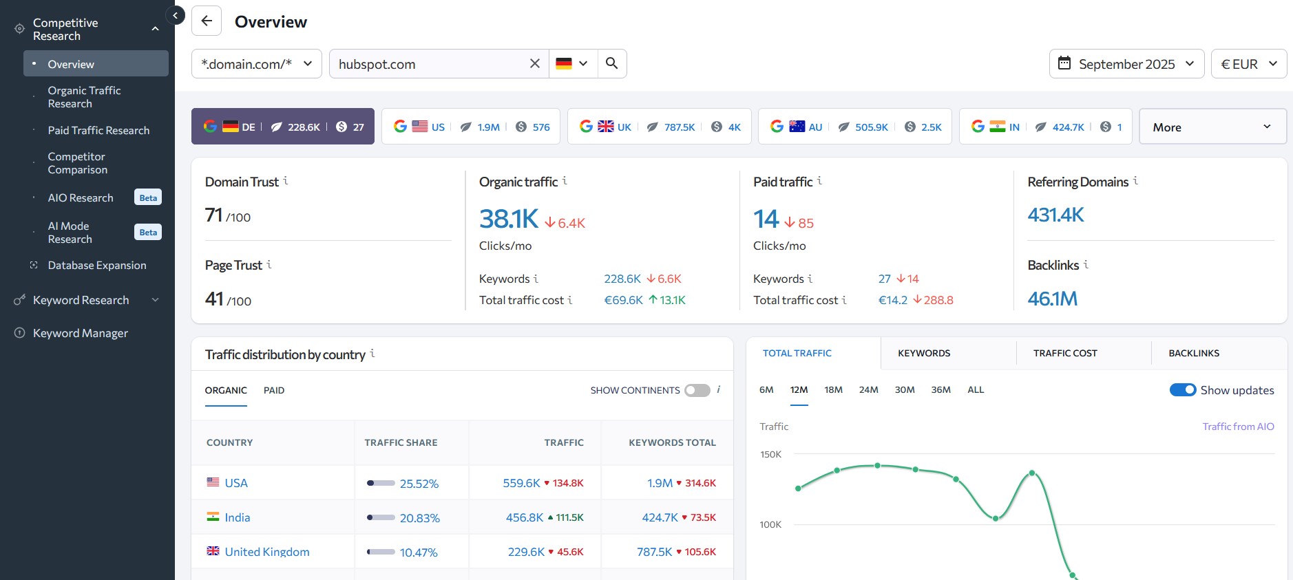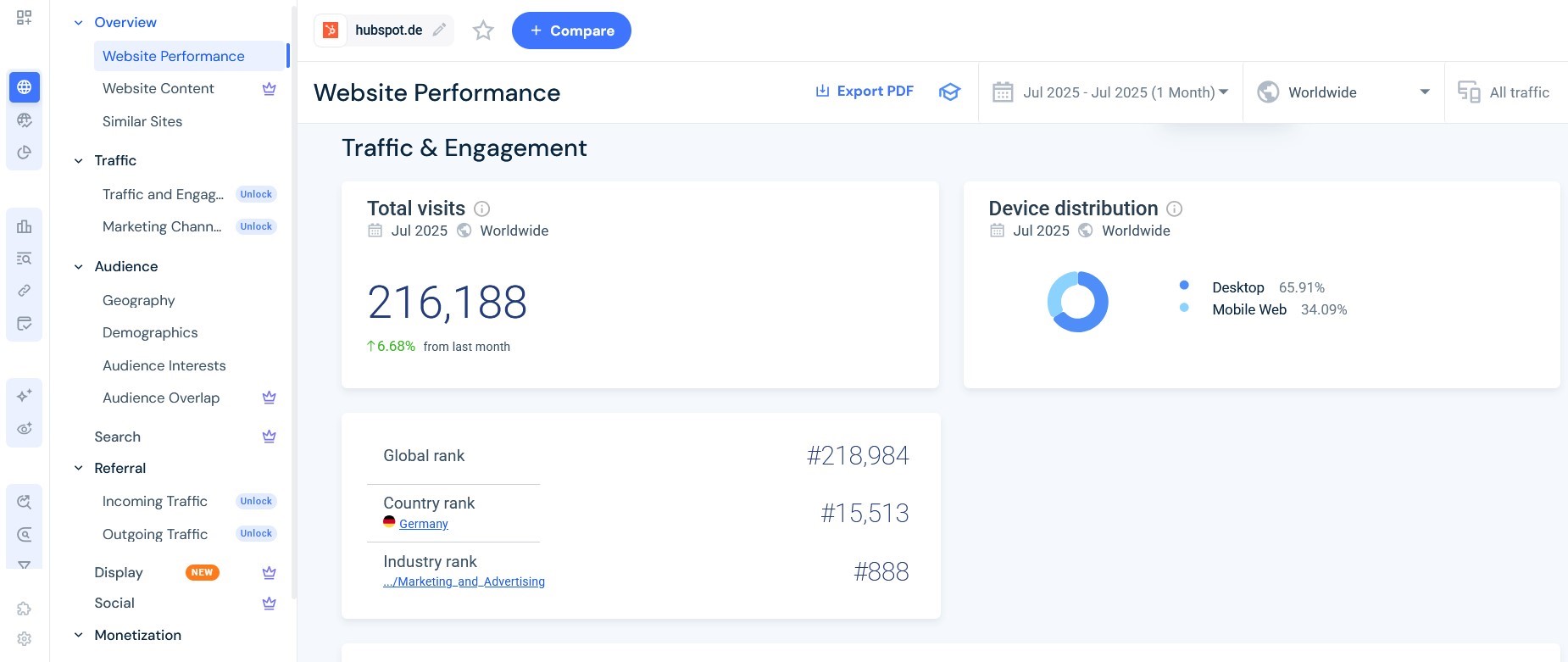 SE Ranking kombiniert Traffic-Schätzungen mit Keyword- und Backlink-Daten und macht damit sichtbar, wie eine Website Besucher gewinnt. Dank Trends und Konkurrenzvergleichen eignet sich das Tool hervorragend für eine schnelle Marktanalyse, auch wenn detaillierte Reports nur in der Bezahlversion verfügbar sind.