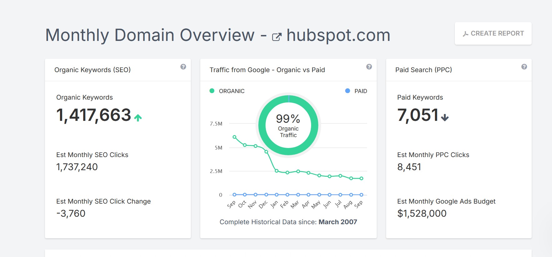 Mit SpyFu können Sie nach Eingabe einer Domain den geschätzten organischen und bezahlten Traffic einer Website einsehen. Das Tool zeigt außerdem, über welche Keywords Besucher und Besucherinnen auf eine Seite kommen, welche Suchbegriffe in Anzeigen genutzt werden und wie sich die Werte im Zeitverlauf entwickelt haben. Auch die Möglichkeit, mehrere Domains miteinander zu vergleichen, ist enthalten und macht SpyFu zu einer praktischen Lösung für Wettbewerbsanalysen.