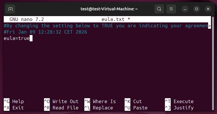 sudo nano eula.txtbashSie finden einen Link zum Vertrag vor, den Sie sich kopieren und im Browser öffnen. Nachdem Sie sich die Bedingungen durchgelesen haben, ändern Sie den Eintrag eula=false in eula=true. Speichern und schließen Sie die Textdatei.