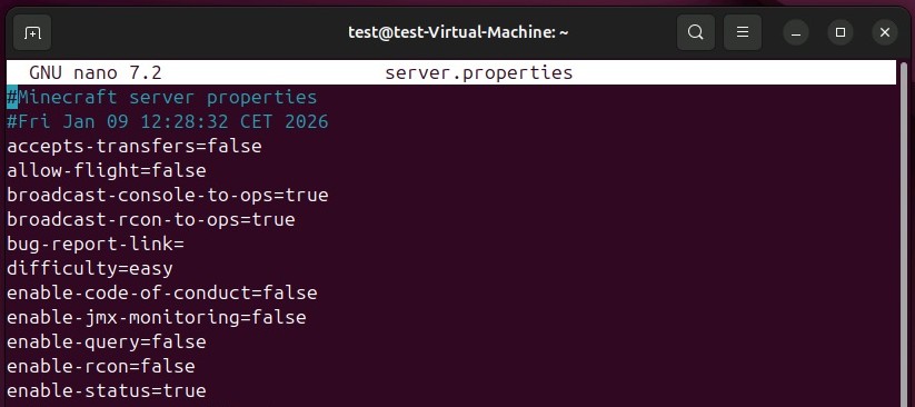 sudo nano server.propertiesbashSie finden eine erste, einfache Standard-Konfiguration vor, in der u. a. der Schwierigkeitsgrad (difficulty) und der Spielmodus (gamemode) definiert sind. Passen Sie die Konfiguration individuell an und speichern Sie die Datei abschließend.
