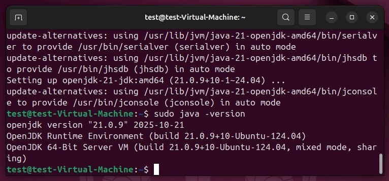 sudo apt-get install openjdk-21-jdkbashMit dem Befehl sudo java -version können Sie im Anschluss überprüfen, ob die Installation des Java-Kits erfolgreich war. In diesem Fall gibt Ihnen das Terminal die installierte Version von OpenJDK aus.
