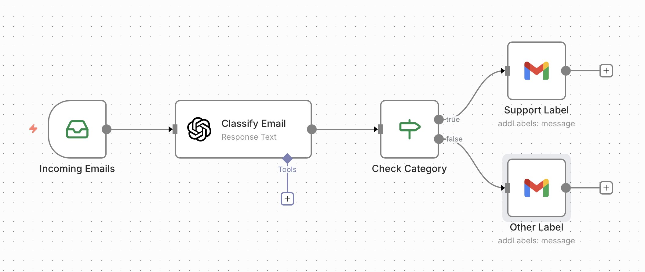 - Gmail-Node zum Setzen von Labels: Im letzten Schritt versieht der Gmail-Node die E-Mail automatisch mit passenden Labels oder verschiebt sie in bestimmte Ordner. Dadurch bleibt Ihr Postfach übersichtlich und wichtige Nachrichten lassen sich schneller erkennen und bearbeiten.