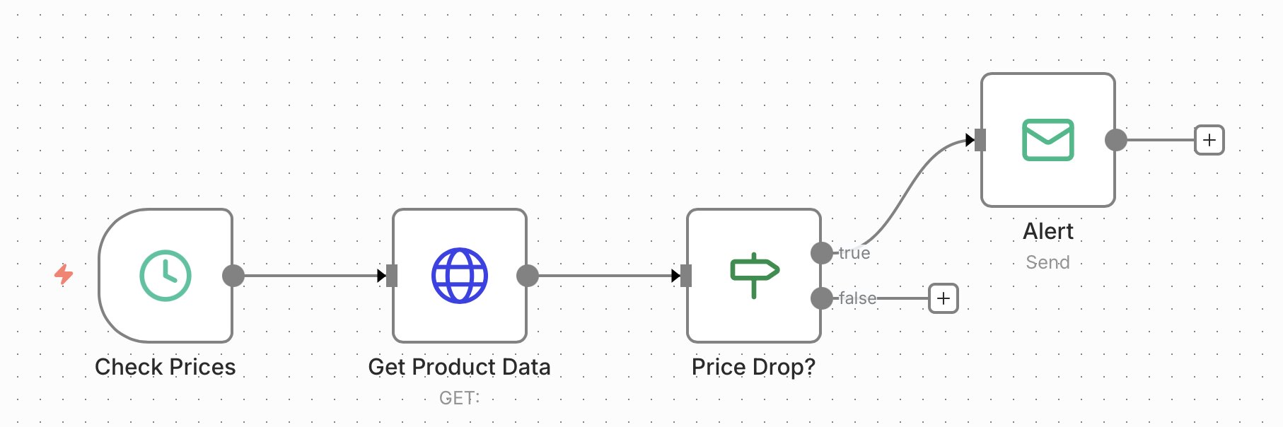 Dieser Workflow überprüft regelmäßig die Preise bestimmter Produkte auf Websites oder über APIs. Sobald sich ein Preis ändert oder ein definierter Schwellenwert erreicht wird, werden Sie automatisch benachrichtigt. Dadurch verpassen Sie keine Angebote mehr und können gezielt reagieren. Besonders für Schnäppchenjägerinnen und -jäger oder im E-Commerce ist dieser Workflow sehr nützlich. Optional können Preisverläufe gespeichert und analysiert werden. Die Umsetzung funktioniert entweder über APIs oder durch Web Scraping (fehleranfällig und nicht immer erlaubt).
