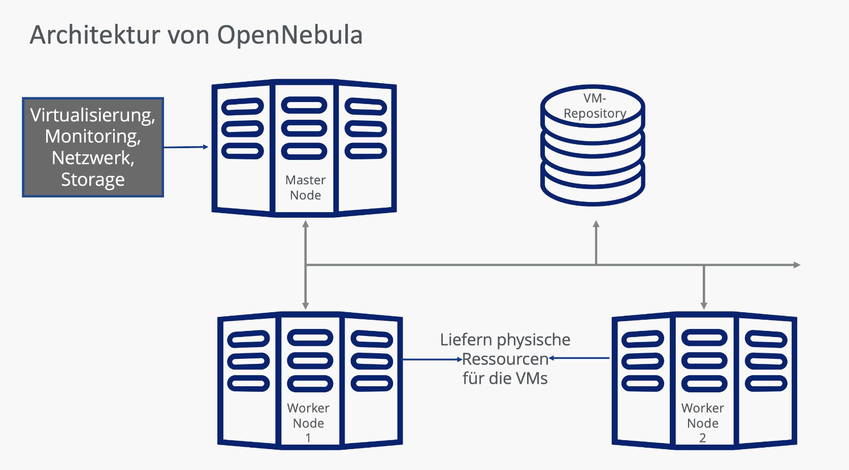 - Front-End/Master: Dieser Knoten beherbergt die OpenNebula-Dienste wie den Management-Daemon (