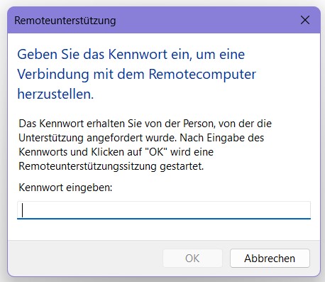 Schritt 4: Mit dem übermittelten Kennwort kann sich die externe Person nun mit dem Remotecomputer verbinden und das zugeschickte Kennwort in das Anzeigefenster eingeben.