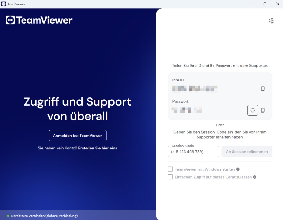 Nachdem Sie den Download abgeschlossen haben, können Sie TeamViewer direkt starten und loslegen. Nach dem Start werden automatisch eine einmalige ID und ein Kennwort für Sie generiert. Diese können Sie jederzeit im Anzeigefenster einsehen und an Ihre Kontakte übermitteln.