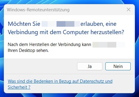 Schritt 5: Bei Ihnen erscheint die Frage, ob Sie der Verbindung zustimmen. Klicken Sie hier auf den „Ja“-Button. Jede Steuerungsübernahme erfordert Ihre Zustimmung.