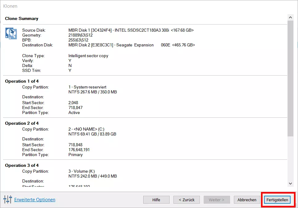 Klickt man danach auf „Fertigstellen“, kann die Sicherung mit einer aussagekräftigen Bezeichnung versehen werden (Standardbezeichnung „My Clone“ ersetzen). Wer möchte, kann den Klon-Vorgang für weitere Wiederholungen abspeichern (als XML-Datei):