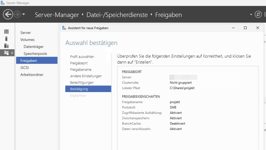 Prüfen Sie die Zusammenfassung im Assistenten und klicken Sie auf „Erstellen“, um die Freigabe anzulegen. Nach Abschluss des Vorgangs sollte die neue SMB-Freigabe in der Server-Manager-Freigabenübersicht erscheinen. Damit ist die grundlegende Einrichtung abgeschlossen.