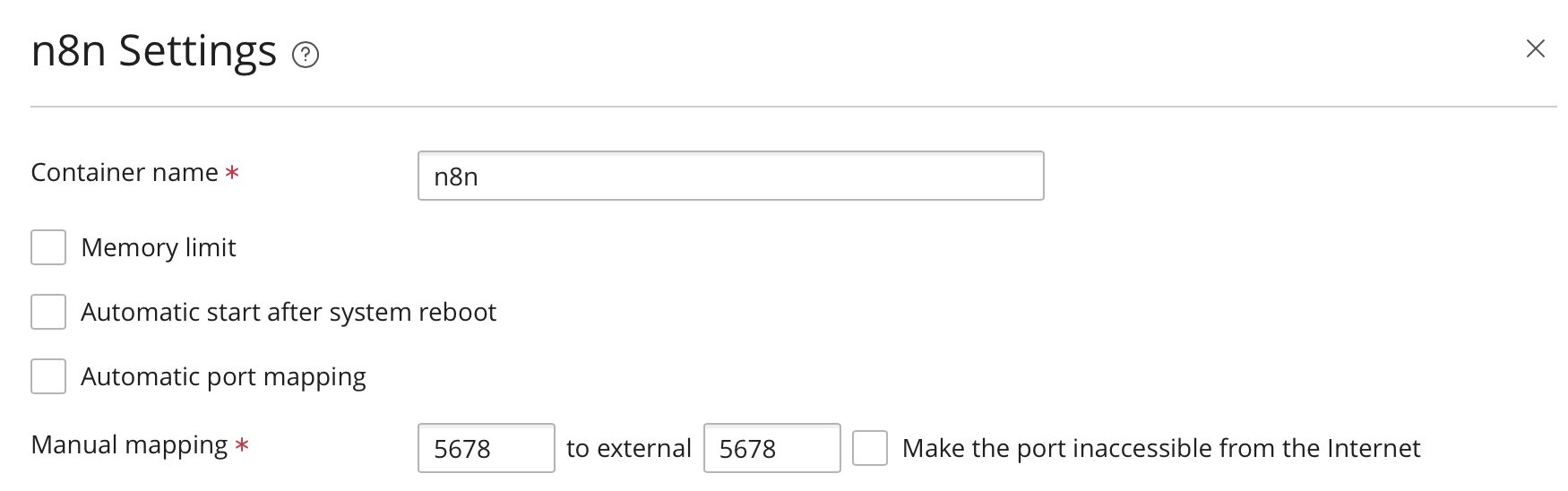 Intern läuft n8n standardmäßig auf Port 5678, daher muss dieser Port im Container verfügbar sein. Als Host-Port können Sie beispielsweise 5678 oder einen anderen freien lokalen Port verwenden. In Plesk ist es oft sinnvoll, einen festen Host-Port manuell zuzuordnen, statt automatisches Port-Mapping zu verwenden, weil sich die Proxy-Regel dann eindeutiger konfigurieren lässt. Wichtig ist außerdem, dass Ihre n8n-Daten dauerhaft gespeichert werden. Legen Sie deshalb für den Container ein persistentes Volume oder Verzeichnis an, das auf /home/node/.n8n gemountet wird. Ohne dieses Mapping würden Konfigurationen und Daten bei einer Neuerstellung des Containers verloren gehen.