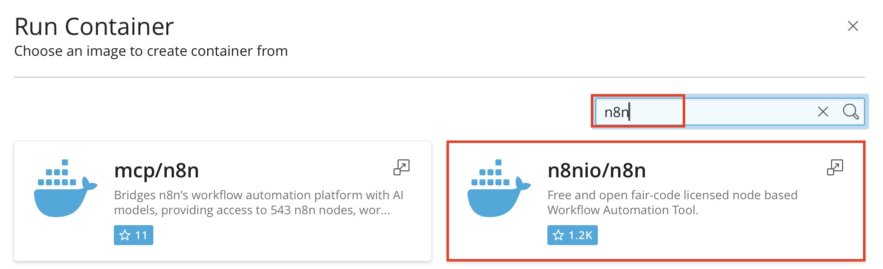 In einem nächsten Schritt richten Sie den eigentlichen n8n-Container ein. Suchen Sie hierzu in der Docker-Erweiterung nach dem offiziellen Image „n8nio/n8n“ und erstellen Sie daraus einen neuen Container.