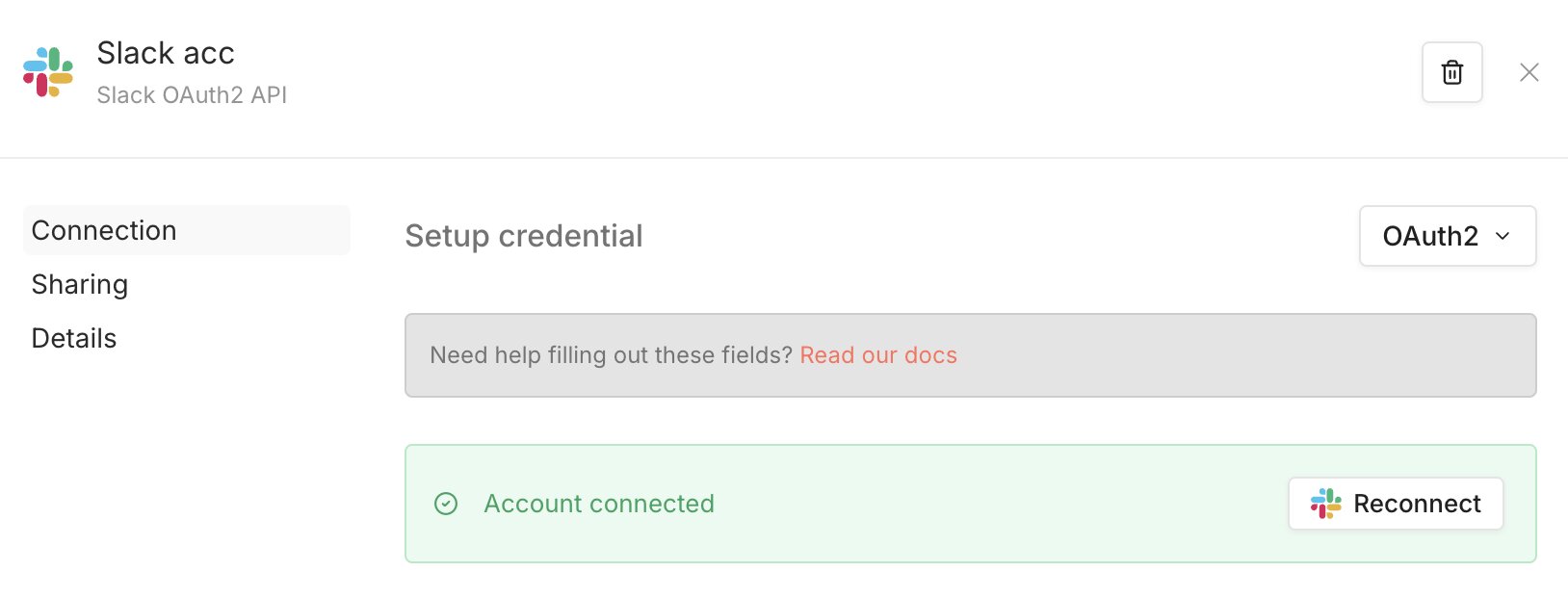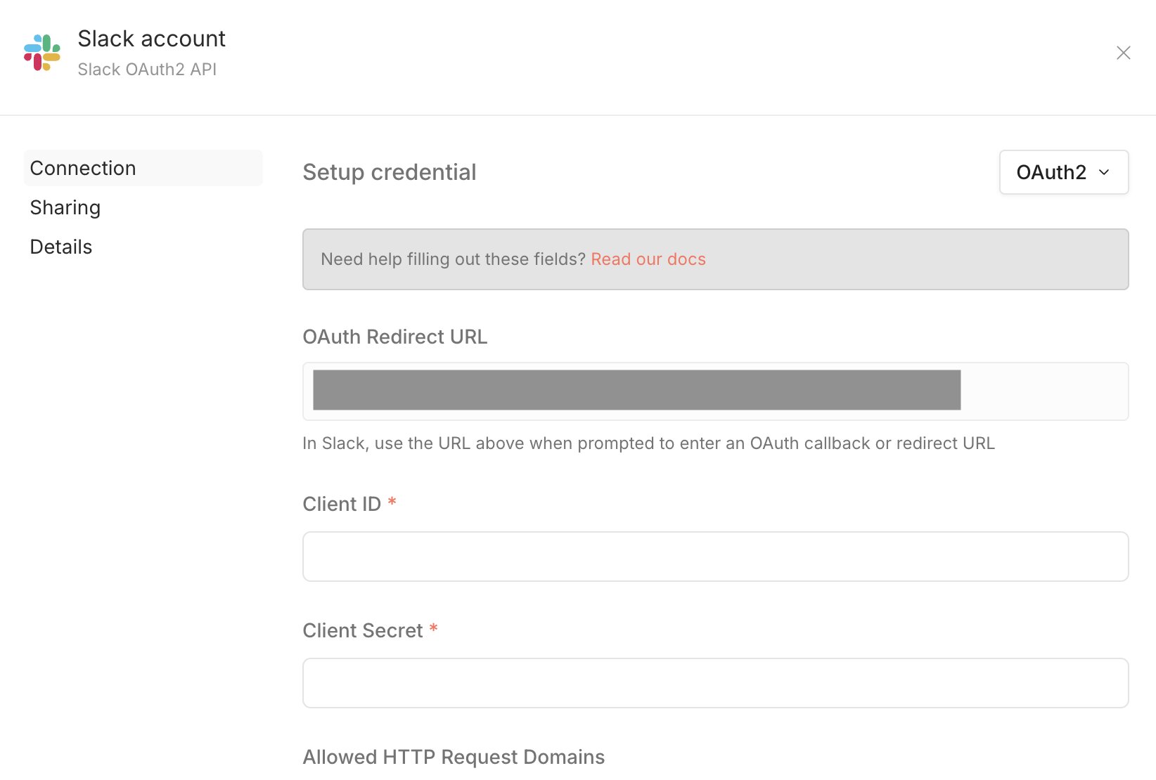 Sobald die App in Slack installiert ist, kehren Sie in n8n zurück und schließen die OAuth-Verbindung ab, indem Sie ID und Secret eintragen.