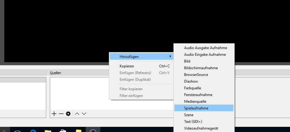 Die Weichen für das Streaming auf Twitch sind gestellt, sodass Sie nun Ihre erste Übertragung auf der Streaming-Plattform starten können. Rechtsklicken Sie im Interface von OBS Studio auf die „Quellen“-Box und fügen Sie die gewünschte(n) Aufnahmequelle(n) (Video, Game, Fenster, Browser etc.) hinzu.