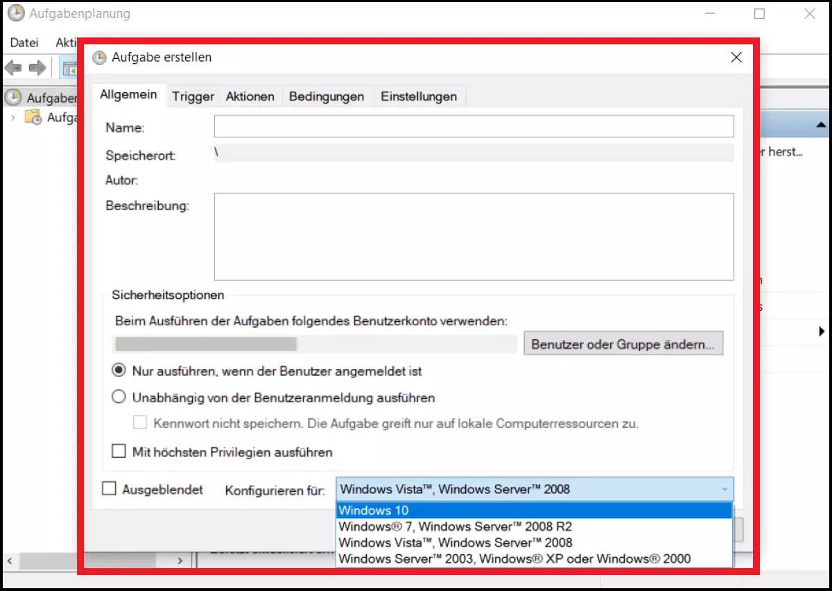 Schritt 3: Gehen Sie auf den Reiter „Allgemein“ und benennen Sie die Aufgabe im Feld „Name“. Aktivieren Sie den Punkt „Unabhängig von der Benutzeranmeldung ausführen“. Auf diese Weise wartet der PC nicht auf eine Anmeldung, um die Aufgabe automatisch durchzuführen. Aktivieren Sie ebenfalls den Punkt „Mit höchsten Privilegien ausführen“. Damit stellen Sie sicher, dass der PC auch bei noch aktiven Programmen herunterfährt. Beim Punkt „Konfigurieren für“ wählen Sie „Windows 10“ aus.