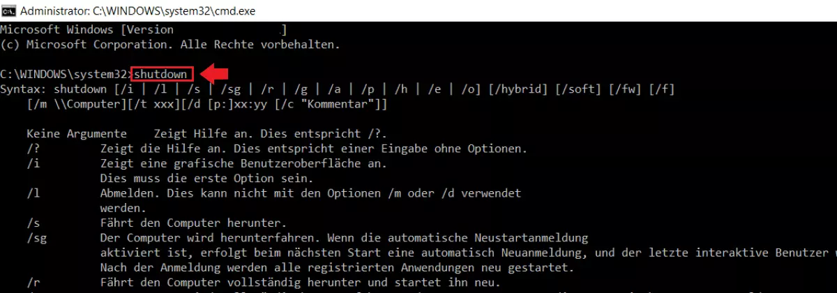 Der Shutdown-Befehl bietet viele weitere Zusätze für benutzerdefinierte Konfigurationen. Um diese in einer Übersicht anzuzeigen, geben Sie einfach „shutdown“ ein und drücken [Enter]. Sie sehen nun Optionen für einen Neustart, das Herunterfahren trotz aktiver Anwendungen oder den Windows-11-Ruhezustand.