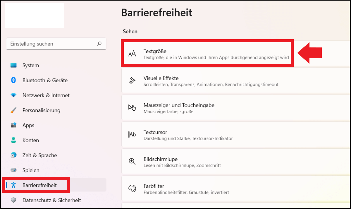 Schritt 1: Öffnen Sie Windows-Einstellungen mit der Tastenkombination [Windows] + [i]. Klicken Sie in der linken Menüleiste auf „Barrierefreiheit“ und anschließend auf „Textgröße“.