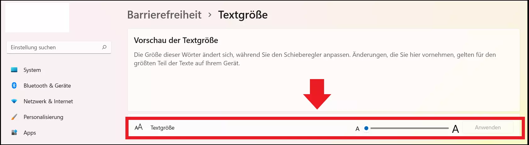 - Ändern Sie die Schriftgröße mit dem Schieberegler neben „Textgröße“.