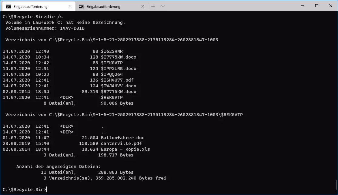 Auf Kommandozeilenebene lässt sich auch eine einzelne Datei aus einem bereits gelöschten Ordner zurückholen. Dazu müssen Sie sich etwas näher mit der Verzeichnisstruktur des Windows-Papierkorbs und der versteckten Ordner auseinandersetzen.