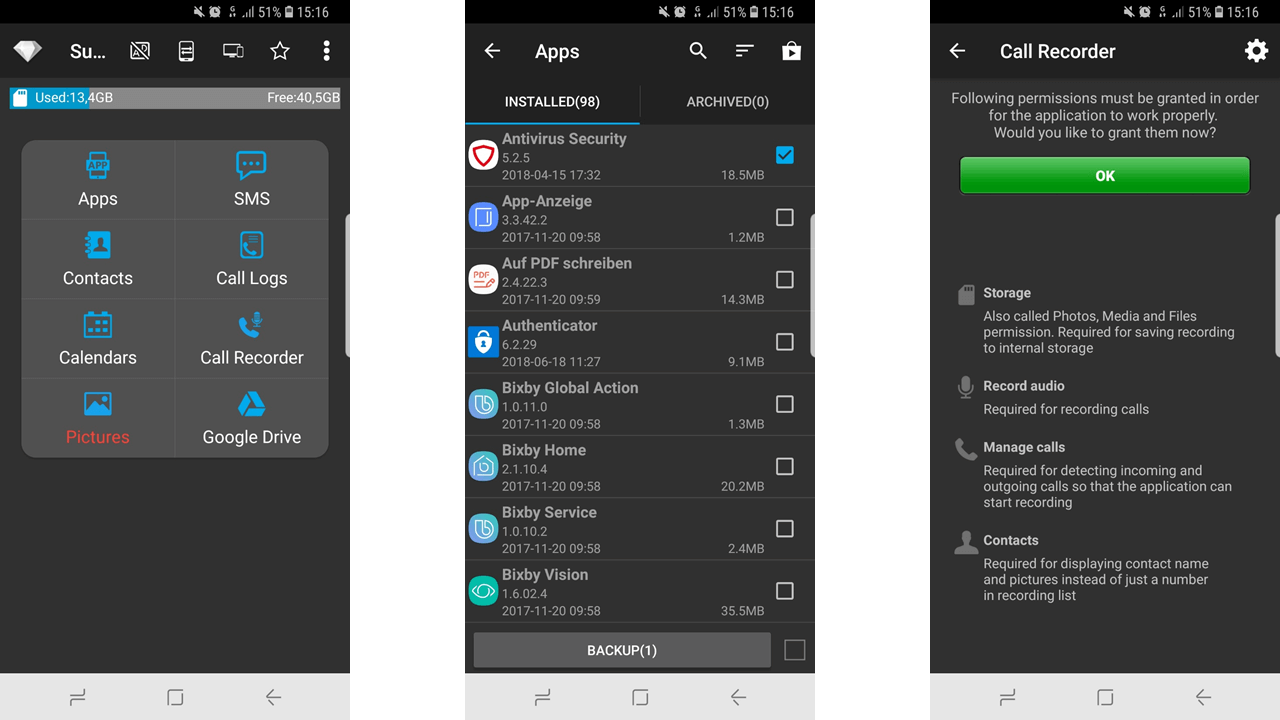 | Super Backup | Lokal, Google Cloud, Dropbox, Gmail | ✗ | Bester Preis | Einmalig: 2,09 € (Werbung entfernen) |