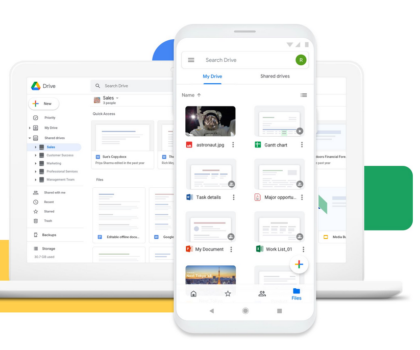 Ordnerverwaltung, Datensynchronisation mit der Google Cloud und File-Sharing (mit anderen Google-Nutzern oder per externem Link) steuern Sie einfach über den prominent platzierten „+“-Button auf der Startseite. Fotos können Sie über Google Fotos ebenfalls in der Cloud speichern lassen, auch automatisch zum Zeitpunkt der Aufnahme.