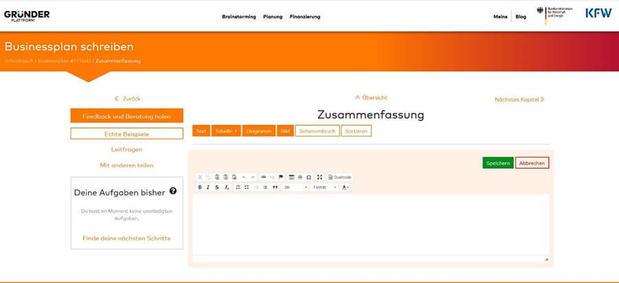 Haben Sie einen neuen Businessplan gestartet, präsentiert Ihnen das „Gründerplattform“-Tool eine komplette Struktur, in der sich die verschiedenen Punkte des Plans einzeln bearbeiten lassen. Je nach Bedarf fügen Sie so Schritt für Schritt Texte, Diagramme, Tabellen und Bilder ein, bis Sie alle relevanten Kategorien ausgefüllt haben. Dabei unterstützt die kostenlose Businessplan-Software Sie u. a. mit folgenden Features: