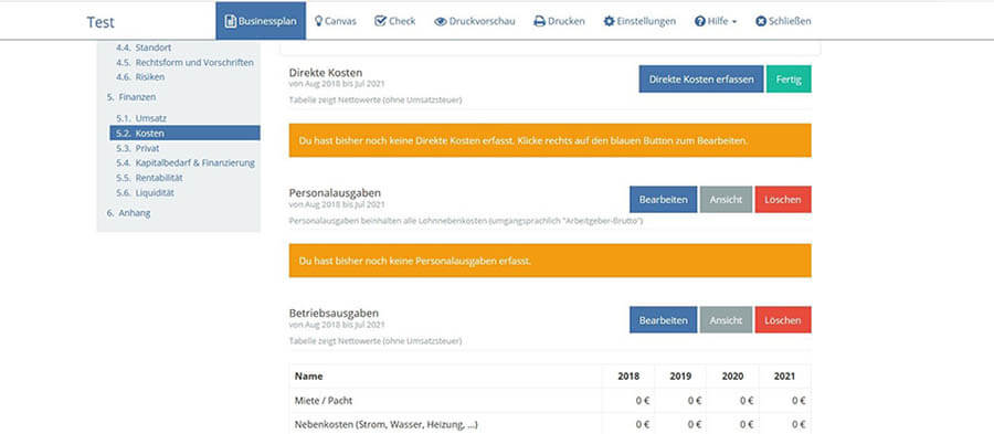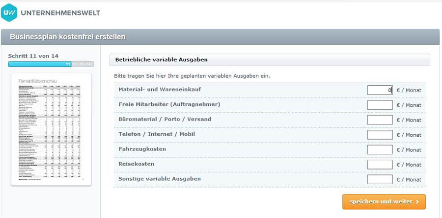Die in Berlin beheimatete Zandura GmbH offeriert auf ihrer Website Unternehmenswelt.de/businessplan-tool ebenfalls eine webbasierte Businessplan-Software, die gänzlich gratis ist. Um das Angebot zu nutzen, füllen Sie zunächst einen achtseitigen Fragebogen zu den grundlegenden Eigenschaften Ihrer Businessidee aus und geben Ihre Kontaktdaten an. Im Anschluss erhalten Sie einen Aktivierungslink, über den Sie die Erstellung des Plans sofort starten können. Der Fokus liegt dabei auf der Planung der Finanzen: In Kosten- und Einnahmetabellen tragen Sie die geschätzten Werte ein, woraufhin der Rest des Businessplans automatisch erstellt wird (mit Wartezeit verbunden).