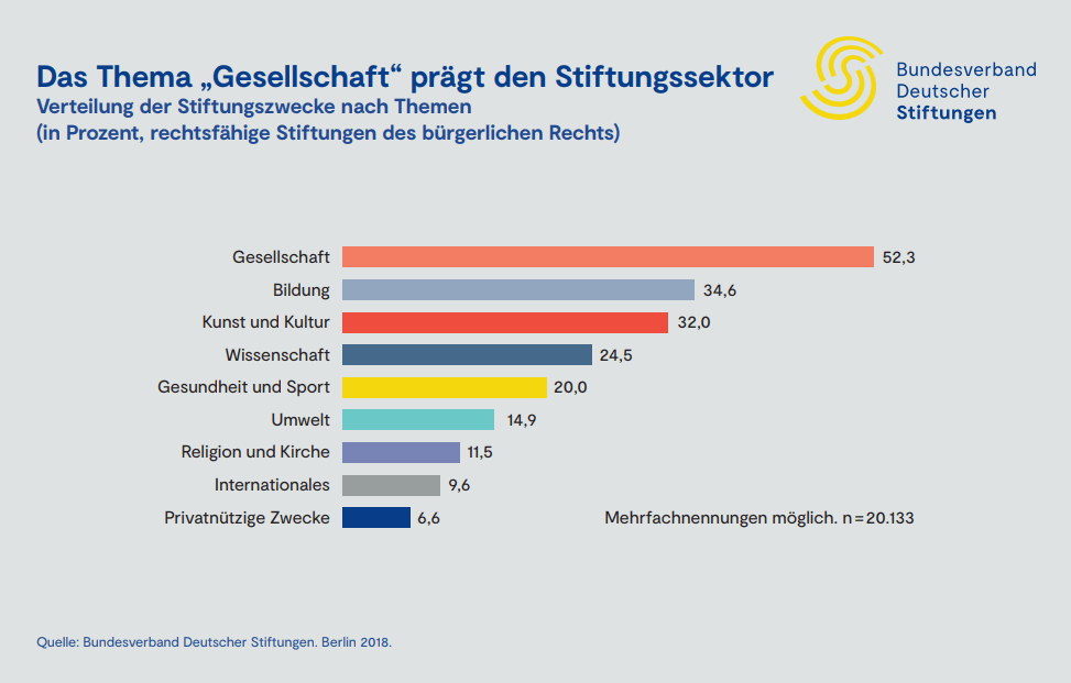 Mit einem Gesamtvermögen von ca. 68 Milliarden Euro können die deutschen Stiftungen häufig maßgebliche soziale Veränderungen vorantreiben. Sie bereichern die Vielfalt der demokratischen Gesellschaft, indem sie Entwicklungsimpulse unabhängig von Wählern und Aktionären liefern. Gleichzeitig ergänzen viele Stiftungen die karitativen Angebote des Staates, können diese aber (vor allem quantitativ) nicht ersetzen.