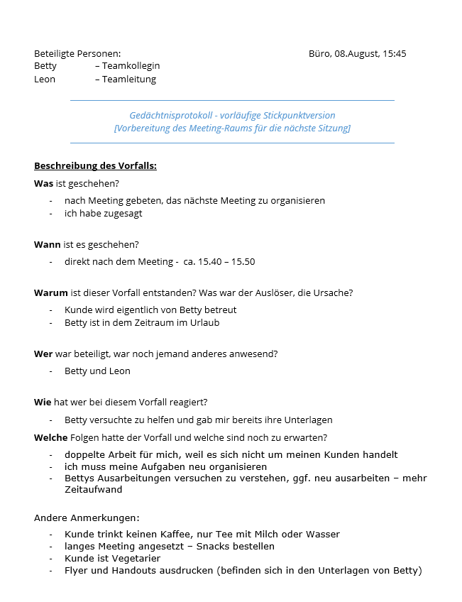 Anhand dieser Leitfragen und Ihrer Notizen können Sie die Erinnerungen zu Protokoll bringen. So könnte ein fertiges Gedächtnisprotokoll zum Beispiel aussehen: